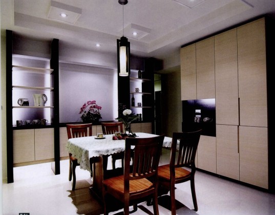 餐廳規(guī)劃了落地收納柜及展餐柜,并配合隱藏式燈,讓空間更為明亮,并減少壓迫感。因?yàn)樵O(shè)有隱藏的展示柜后面的燈具,餐廳里只用一盞簡(jiǎn)單的燈具,與利落的空間相呼應(yīng)。