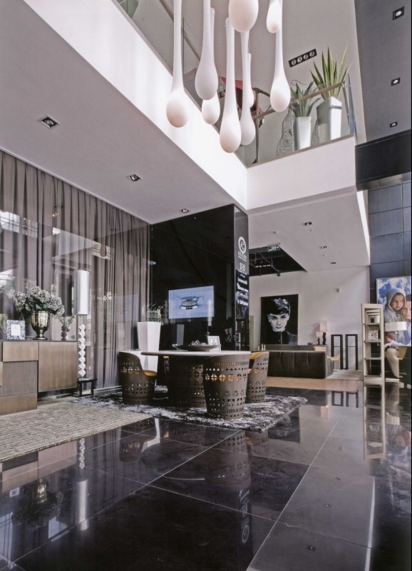 這是一個清新脫俗的現(xiàn)代貴族家居風格。從入門處的布簾用了灰、白、金三種顏色,可以自由調(diào)配,集家具和飾品為一體的時尚空間。彰顯品牌的空間和高貴氣質(zhì)。櫥窗里兩個白色新古典吊燈從二樓垂下,飛碟桌配合精心挑選的飾品和花卉,展示出一個芭蕾舞者的氣質(zhì)。整個空間用回廊的方式迂回,可以讓客人有組織而又自由地穿梭其中,每走進一個區(qū)域都會有發(fā)現(xiàn)、有驚喜。