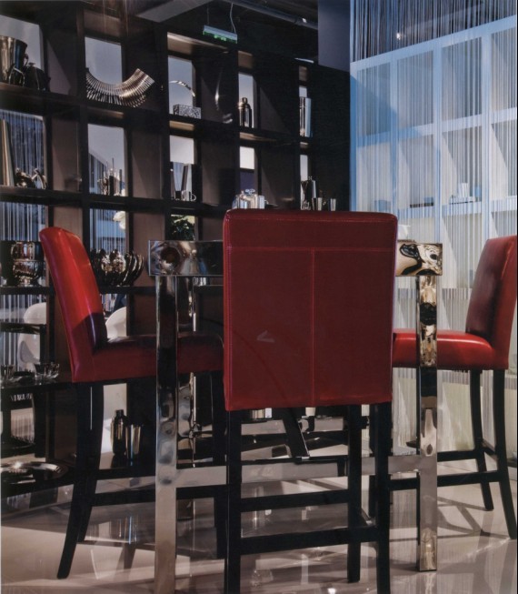 血紅色的皮椅,給小餐廳里增加浪漫情調(diào)。在深色系里,血紅色沙發(fā)如同夢露的紅唇般誘人。格子架的古玩收藏空間里,透過間隙看另一邊,使空間變得更加通透。