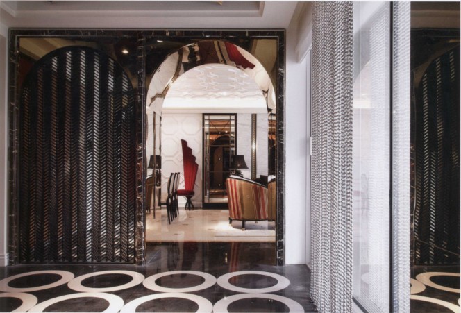 黑底白圈的地坪延伸到起居室。不銹鋼鏡面的傘狀天花,左右對稱的黑金花、金色鍍鈦板拱型穿廊和窗花,使軸線變得方正,也讓玄關形成正式的迎賓空間。