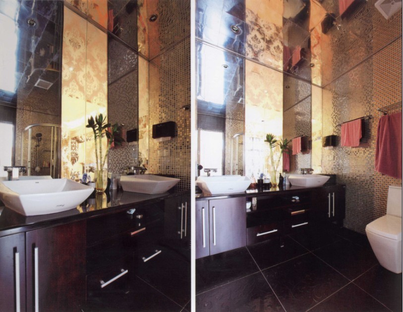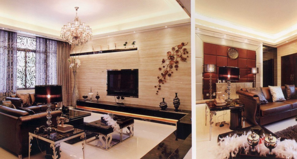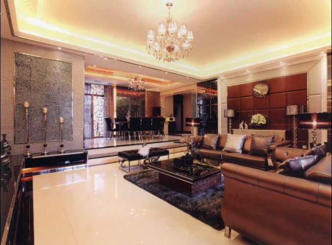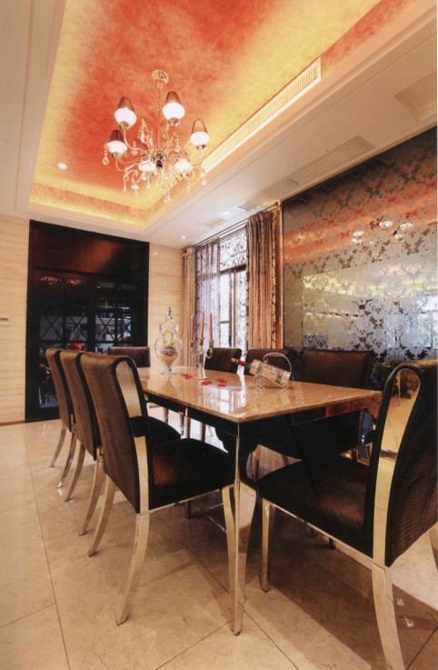 在不失沉穩(wěn)、大氣,體現(xiàn)簡(jiǎn)約、低調(diào)、華貴的豪宅氣度的同時(shí),設(shè)計(jì)師采用米色天然洞石作為主材,而背景墻則采用灰鏡搭配西式風(fēng)格的皮革。在餐廳處,設(shè)計(jì)師為體現(xiàn)豪宅的低調(diào)奢華,運(yùn)用了材質(zhì)的軟硬搭配方式,餐廳背景墻的壓花灰鏡與咖啡色的大花紋壁紙,體現(xiàn)出了空間獨(dú)特的尊貴感。