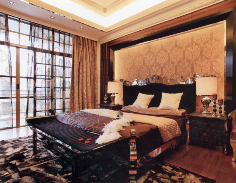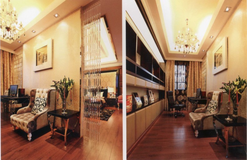 臥室部分,設(shè)計(jì)師將書房與臥室融為一體,采用簡(jiǎn)易的水晶簾來(lái)分隔空間,在書房形成半通透效果的同時(shí),水晶簾與衛(wèi)生間的灰色絢麗的陶瓷錦磚相呼應(yīng),更是彰顯出奢華而不張揚(yáng)的格調(diào)。主臥室床頭背景墻的墻紙與大膽的黑色寬木線條保持統(tǒng)一和協(xié)調(diào),體現(xiàn)出設(shè)計(jì)與地域文化的緊密結(jié)合,更營(yíng)造出完美而舒適的大宅空間。