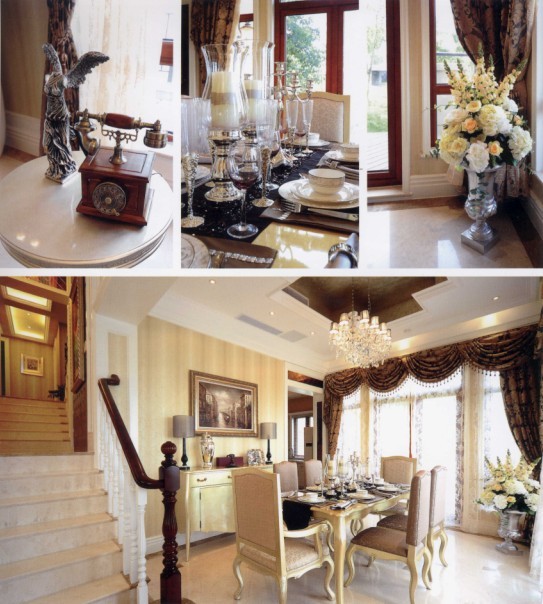 餐廳:擺設(shè)整齊有序的餐具、透明的高腳杯、華麗的餐布、象征古典主義風(fēng)格的燭臺(tái),都讓人有身臨其境的懷舊情愫。設(shè)計(jì)師將古董擺設(shè)在餐廳最醒目的位置,從而來體現(xiàn)室內(nèi)悠久而深遠(yuǎn)的歷史文化內(nèi)涵。