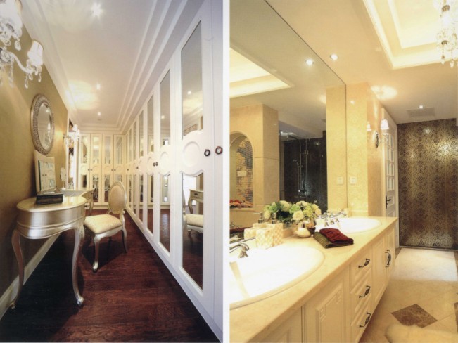 玄關(guān):入門正對(duì)的是玄關(guān),玄關(guān)是室內(nèi)空間給人的第一印象,僅從玄關(guān)的設(shè)計(jì)就可以看出整體的風(fēng)格。玄關(guān)的過道左邊是兩扇拱形假窗;右邊是典型的美式白色油漆鞋柜;玄關(guān)的端景是極具古典主義的油畫。美式新古典主義風(fēng)格就是由一些小細(xì)節(jié)堆積出來的。