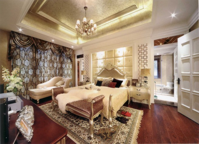 客廳:客廳作為待客區(qū)域,它的裝修較其他空間顯得更為簡(jiǎn)潔明快??蛷d內(nèi)鋪置大面積的地毯,并搭配造型優(yōu)雅而舒適的美式沙發(fā)??蛷d的落地窗簾,盡顯大氣與華貴。頂棚的水晶吊燈絕對(duì)是客廳的一大亮點(diǎn)。