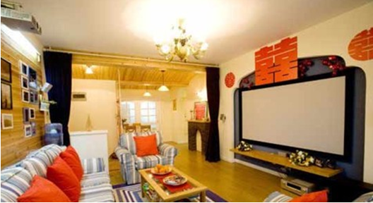 還好,房間還是存在著地中海的氣息的。那也只能從沙發(fā)上體現(xiàn)了。原木的沙發(fā)背景貼上點照片。整個空間出來書是混搭之外,真說不出其他形容詞。