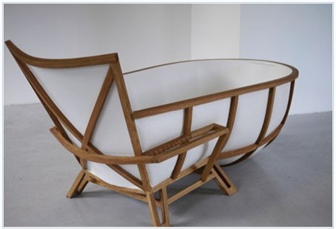 該浴缸尺寸為190厘米長×85寬×84厘米高,木條把整個浴缸都包裹起來,整個造型有明顯的扶手和椅腿,就像是一把巨型的躺椅。