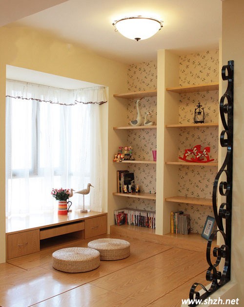 在中小戶型里,將某間房間設計成榻榻米形式,可以說是最能節(jié)省空間、擴大房間功能的方法。制作榻榻米房間時,可將房間地面抬高,做在房間里面,中國的榻榻米下面是可以打開放東西的柜子,中間還有個升降桌,圍著升降桌坐的時侯,根本不需要盤腿,腿是可以放下去的,跟平時坐凳子差不多。并在地臺內設計若干個上拉門式或側拉門式儲物柜,可存放大量的被褥及其他雜物,節(jié)省出許多儲物空間;同時,榻榻米可以承擔品茶、聊天、休閑、閱讀、睡眠等多種功能,特別是對于中小戶型業(yè)主來說,具有極為強大的“夜間親朋留宿”的功用。