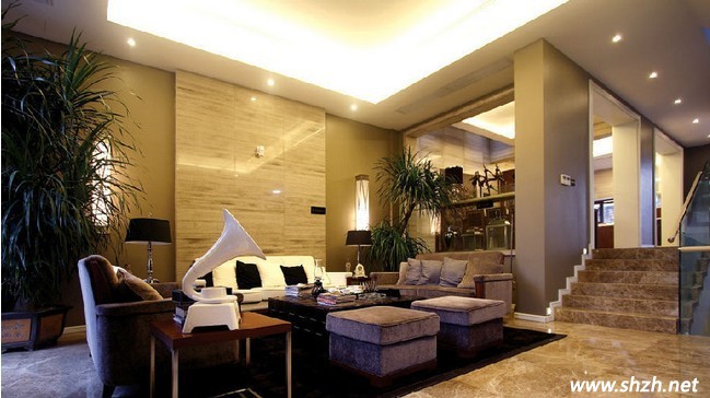 大家再跟著小編想四周墻面和地面上看去,兩者的材質采用的都是大理石,再加上燈光的照射讓墻壁和地面顯得非常有光澤??蛷d內擺放的體積比較大的綠色植物盆栽,讓整個客廳不僅有著古典歷史文化的氛圍,而且也體現(xiàn)出了客廳的自然樸實的氣息。