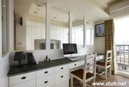 舒服與客廳采用直線條的玻璃取代實墻隔間,陽光灑落時呈現(xiàn)束狀線條,更具美感。白色的書桌與凳子看上去是更加簡潔美觀。