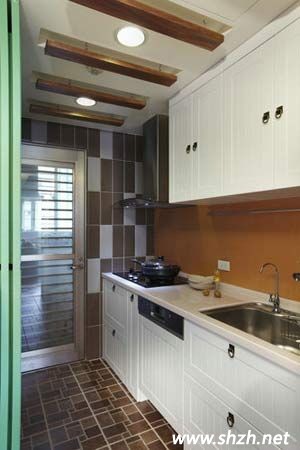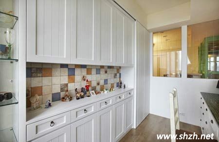 廚房經(jīng)典的美式格子線條,漆上大自然的青草淺綠,前方吧臺不但將電器柜功能融入,馬賽克磁磚讓用餐時充滿趣味,點亮了繽紛的鄉(xiāng)村生活。