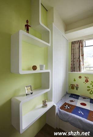 嫩綠色的男童房,置物柜跳脫制式規(guī)范,套入不規(guī)則的線條延伸向上,讓功能性的表現(xiàn)有更多變化。各種材質的搭配巧思,足見設計師詹秉縈的細膩之處,如整體空間使用暖色與代表鄉(xiāng)村風的元素,營造出溫暖活潑的居家氣氛。