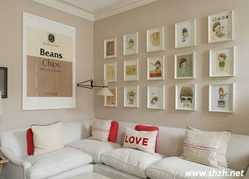 代替一整幅的壁畫(huà),用多個(gè)小相架裝飾單調(diào)的墻壁,還能展示新婚夫婦的結(jié)婚照,讓客廳縈繞著甜蜜。紅白搭配的抱枕起到隔開(kāi)大片白**塊的作用,讓房子達(dá)到冷暖平衡。