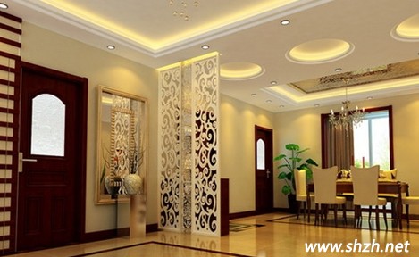 餐廳的壁畫墻是可以讓人駐足的地方,餐桌也要同樣的華貴典雅,吊頂可以采用浮雕圓形來實現(xiàn),會增添許多層次動感。
