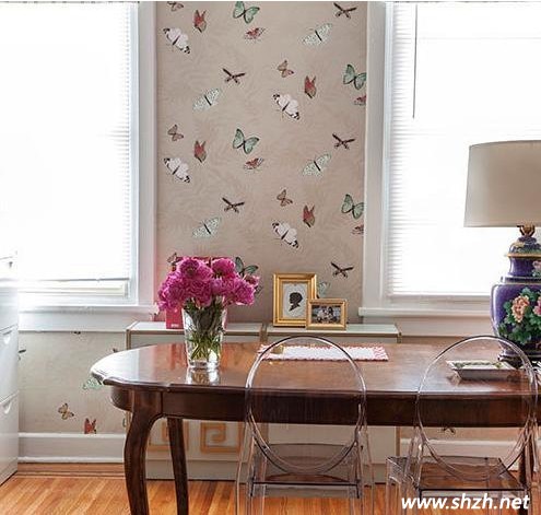 解析:圖一中帶有蝴蝶圖案的壁紙是這個居室的一大亮點(diǎn),不似其他居室的單調(diào),著實(shí)增添了許多活力。桌臺上的鮮花跟蝴蝶壁紙搭配的和諧美觀。同時為了讓居室彰顯年輕時尚的氣息,透明椅子的加入是在是妙舉!