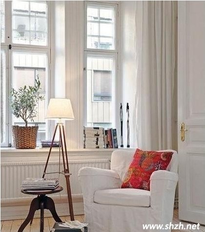解析:不拘泥與傳統(tǒng)的書房設(shè)計(jì),簡簡單單的這樣一張沙發(fā),一個小茶幾就滿足了我們的閱讀需求,白色的沙發(fā)與白色的墻壁門窗相互呼應(yīng),好不清新。