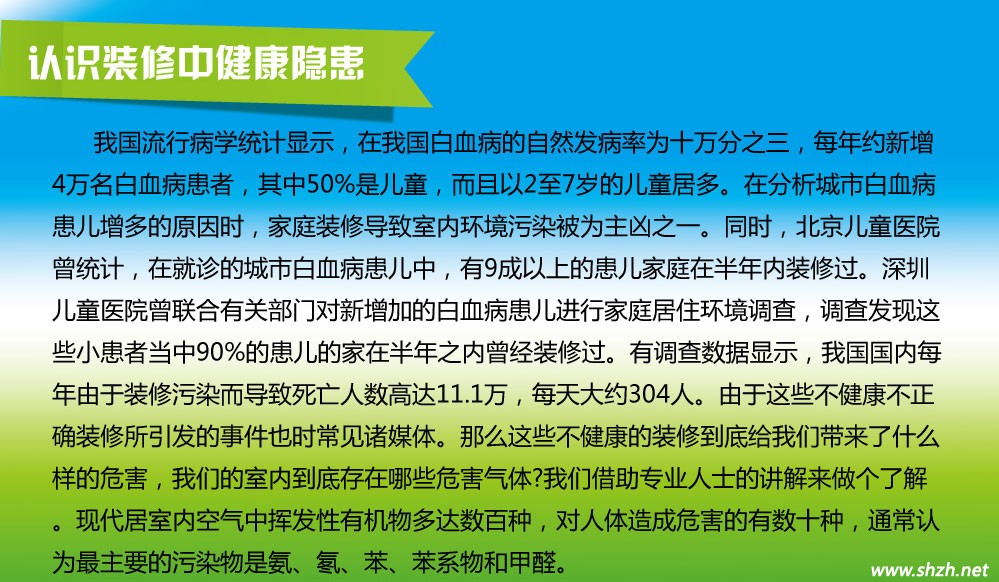 資料顯示,1/3的白血病患者發(fā)病與家庭裝修有密切關(guān)系。這是因?yàn)檠b修中天然石材射線會損害人體造血功能,油漆、涂料、黏合劑等含有的化合物(尤其是苯類),被人體吸收后可使DNA斷裂和移位,導(dǎo)致細(xì)胞癌變。醫(yī)學(xué)研究證實(shí),長期接觸苯、甲醛類物質(zhì)人群患血液病概率要高于普通人群。
