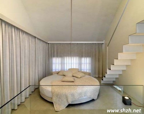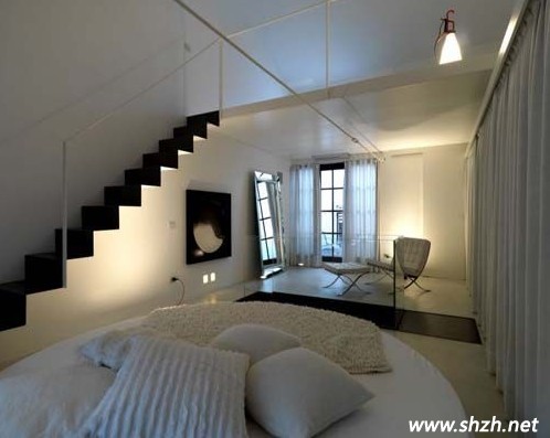 三樓臥室圓床邊的樓梯通向四樓,圖四中的第一幅圖可以看見四樓的全景,左側(cè)是一個(gè)巨大的浴缸,讓你享受沐浴的快樂,右側(cè)也是一個(gè)臥室的設(shè)計(jì),整棟LOFT的風(fēng)格都是極致簡(jiǎn)約。四樓中還有一個(gè)樓梯,小編這里就不為大家展現(xiàn)五樓的風(fēng)景了,由大家去想象吧!
