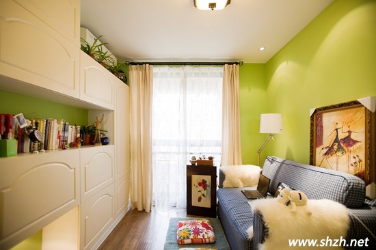 書房的墻壁采用了淡綠色打造,很貼近自然的色彩,而且你有沒(méi)有發(fā)現(xiàn),美式的風(fēng)格裝修,不論哪個(gè)角落,你都能欣賞到清新的綠植??磿竦纳厦娴膸着杈G植,是不是非常的美妙呢?