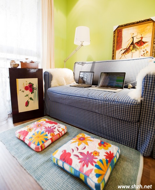 小格子的藍(lán)色布藝沙發(fā),布藝天然的感覺(jué)很好的襯托了美式風(fēng)格的裝飾。而兩個(gè)花朵圖案的坐墊,瞬間提亮了整個(gè)書房空間,為沉悶的書房增添了許多活躍的氛圍。