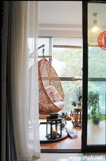 中式風(fēng)格的圓形鏤空坐凳,配上現(xiàn)代時(shí)尚的圓形吊椅,趣味十足。而后面的竹子編織而成的鏤空隔斷,古色古香的感覺,很有中式的風(fēng)味,整個(gè)區(qū)域搭配得十分協(xié)調(diào)。