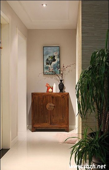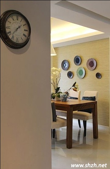 看看餐廳的裝飾,幾個(gè)圓形盤裝飾的背景墻,創(chuàng)意十足,是近代比較流行的設(shè)計(jì)樣式。青花瓷的裝飾,注入了中國(guó)的元素,整體搭配得十分完美。再看看玄關(guān)的設(shè)計(jì),墻上的掛畫很有中國(guó)傳統(tǒng)文化的味道。黑色花瓶里的桃花,典型的中國(guó)風(fēng)味,木質(zhì)打造的收納柜,古典而莊重。而條形的布藝沙發(fā),是美式風(fēng)格的最愛,清新自然的味道。實(shí)木打造的地板,很有歷史的厚重感覺。
