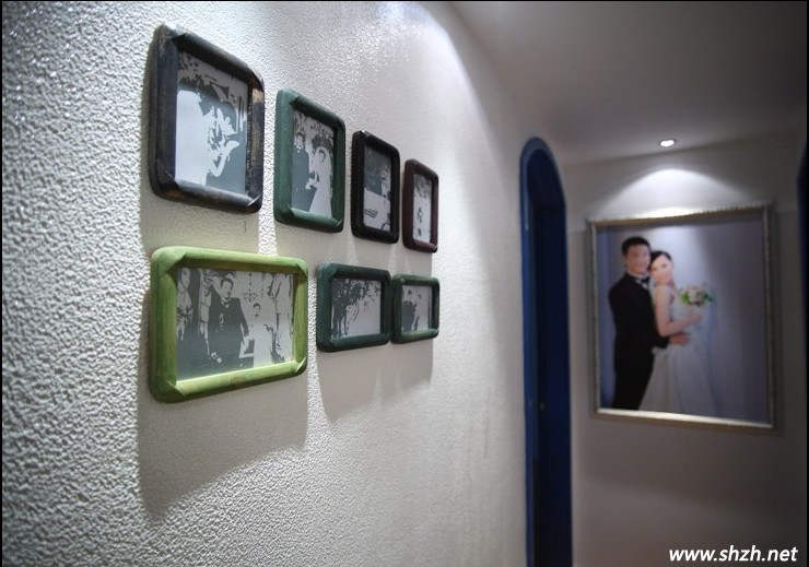 從這里進(jìn)去就是婚房了,凹凸不平的白色墻壁,紋理清晰可見,古典的相框裝飾墻壁,純白的墻面不再變得單調(diào)乏味。而婚紗照的擺放,讓我們感受到了愛情的美麗。
