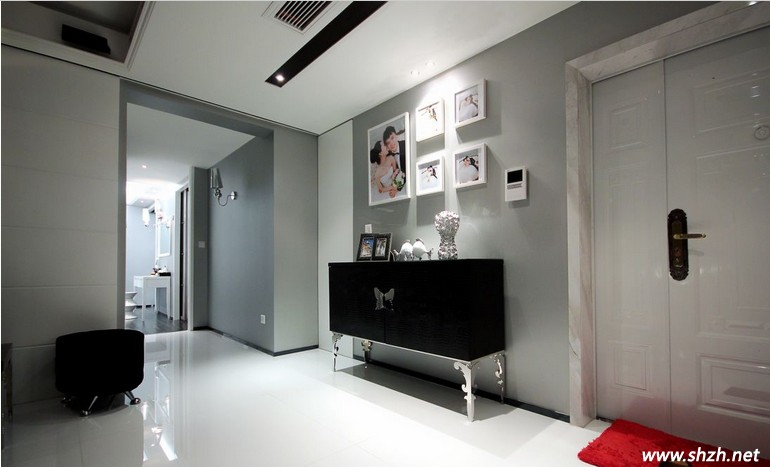 白色是古典的一種色彩,在居室裝修中,使用白色為主色調(diào),能夠使整個(gè)室內(nèi)看起來(lái)更加寬敞明亮,大方得體。而黑色則給人帶來(lái)神秘的恐懼感,也許很多人在裝修中都不敢使用黑色進(jìn)行裝飾,其實(shí),黑色與其它的色彩合理搭配,也能產(chǎn)生別樣的風(fēng)采。從古至今一直流傳這樣一個(gè)詞“黑白配”,黑白永遠(yuǎn)是最配的色彩。看這款設(shè)計(jì),以白色為主,黑色家具作為裝飾,用現(xiàn)代的手法和材質(zhì)還原古典氣質(zhì)。黑色精致的皮質(zhì)沙發(fā),豪華而大氣,融合了各種豐富的元素,傳統(tǒng)中帶著現(xiàn)代奢華的氣質(zhì),而材質(zhì)細(xì)膩、做工精細(xì)的抱枕,彰顯奢華高貴的氣質(zhì),體現(xiàn)出主人對(duì)生活的高要求以及對(duì)生活的熱愛(ài)。墻上的婚紗照,明顯的后現(xiàn)代風(fēng)格,溫馨浪漫的情調(diào)深深吸引著我們。而紅色的地毯寓意著熱情似火的愛(ài)情觀念,且為這淡雅的居室情調(diào)增添了幾分活躍的氛圍。
