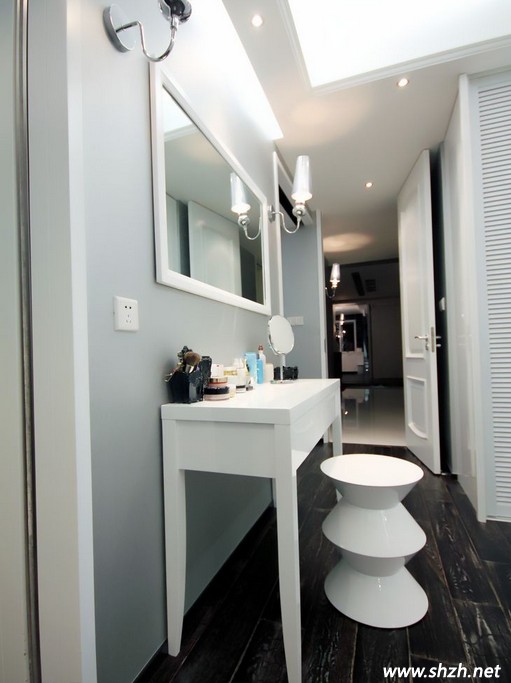 臥室與衛(wèi)生間之間僅用一面墻隔開(kāi),而中間則設(shè)置成一個(gè)梳妝臺(tái),純白色打造,造型可愛(ài)的凳子給單調(diào)的空間帶來(lái)了許多的樂(lè)趣。黑色的木質(zhì)地板,莊重古典的氣質(zhì),古典與現(xiàn)代的完美結(jié)合,創(chuàng)造了一種意義的合成,一種立體的美學(xué)合成。
