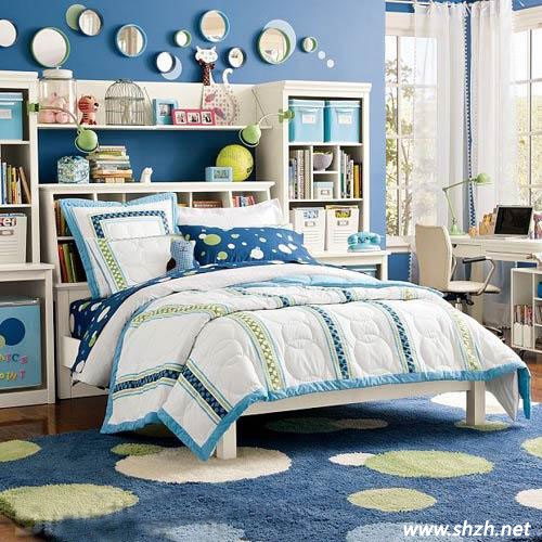 一樣子的原理,只不過這間房間的主人好像更熱愛學習,床頭書柜上放滿了書籍,旁邊的書桌也看出主人所有的設計都是為了方便學習,看來這個小主人還真是個不折不扣的讀書狂呢!藍白的主色調(diào)看上去清爽極了,正值炎炎夏日,喜歡的還在等什么呢?