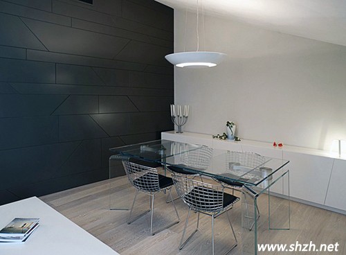 客廳自然是設計的重點,但由于現(xiàn)代人對生活品質(zhì)的追求,餐廳已不僅僅是一家人吃飯的地方了,還要時尚美觀。在客廳的旁邊開辟了一個用餐的區(qū)域,玻璃的餐桌,鐵藝座椅的完美結(jié)合,倍感清涼與舒適。