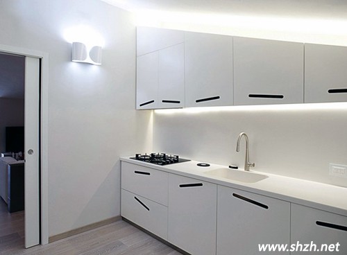 廚房的設計也不能落后,各種獨特的設計讓人驚嘆。白色的廚房空間,盡顯寬敞和明亮,而碗柜上的門把手,摒棄了傳統(tǒng)的模式,并不是整齊的排列,而是歪歪扭扭的設置在廚門之上,變得趣味十足,也讓人感覺到它的活潑與調(diào)皮。