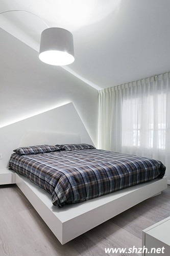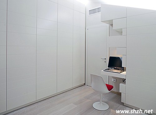 臥室是休息的地方,不過,現(xiàn)代很多人,也將工作設計再了臥室內(nèi)。在這個小角落里,設置了電腦,仿佛這個墻壁要將它吞噬掉一樣,很有趣味。而床的設計,很普通的感覺,一張簡約的床就足以,很實用,不過,床頭凸起的線條卻讓整個空間變得非常有趣味。而特色的鏡子,雜亂無章的排列,使整個空間趣味無窮。