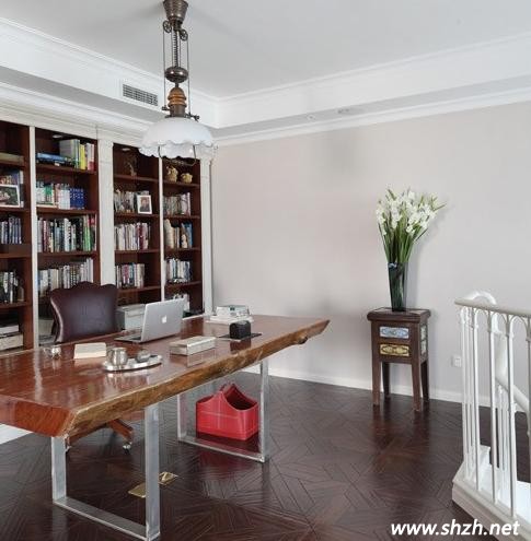 沿著階梯網(wǎng)上走,我們來(lái)到了主人的書房,非常典雅與別致,每一處都體現(xiàn)出主人熱愛(ài)學(xué)習(xí),熱愛(ài)生活的品質(zhì)。書房的空間是非常通透的,對(duì)面就是一個(gè)大的落地窗戶,除了自然采光好之外,還可以吸納室外的美景,讀書再累再疲倦只要一抬頭,美景就會(huì)將疲倦吹得煙消云散。我們還可以看到,吊燈的設(shè)計(jì)非常的具有特色,我想應(yīng)該是主人從海外購(gòu)置回來(lái)的,因此能感覺(jué)得到主人對(duì)它的愛(ài)護(hù)。