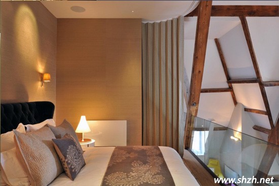 臥室的設(shè)計,采用了一塊玻璃欄桿作為阻隔,既安全,又能很好的裝飾,而且還采用了窗欄進行遮擋,很好的做到了私密保護,如果想對外開放,還可以隨時將窗簾收拾好,非常實用,又達到美觀性能。