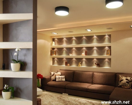 方案三:無需刻意的強(qiáng)調(diào)照片墻的存在,從墻壁中“借”出來的置物架大大節(jié)省了室內(nèi)的空間,每一排都裝上小射光燈,再擺放上滿意的自戀照片,這還需要你刻意的去點(diǎn)明嗎?它們已然成為了客廳中的主角。