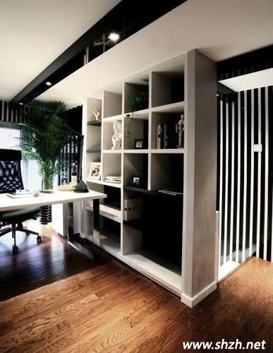 現(xiàn)今大熱的黑白條紋在這個空間被發(fā)揮的淋漓盡致,瓷磚的選用也非同尋常,創(chuàng)造出的視覺性效果很強,整個空間巧妙的運用了黑白灰色調讓品味得到了充分的提升。不同的空間界面在處理時可以采用深黑色烤漆玻璃來作為色彩的延伸,墻體可以運用一些透明的玻璃,這樣不僅能在視覺上擁有穿透感,又能富有實質性的將空間隔斷。整個書房在設計上很有男性的風格,少了女性化的**與嫵媚,更多了幾分男性的陽剛之氣。