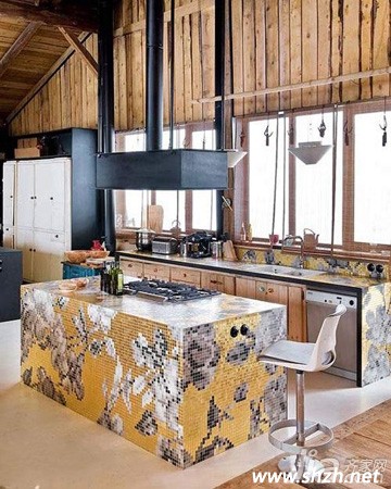 廚房中,櫥柜采用的是一字型的排列方式,其上鋪貼的黃色花紋型馬賽克給整個木系別墅都增添上了一層藝術氣息。黑色的抽油煙機深沉內(nèi)斂。另外櫥柜和收納柜被統(tǒng)一安置在了房間的伽羅里,這樣在節(jié)省了空間的同時也省去了讓空間凌亂的麻煩。