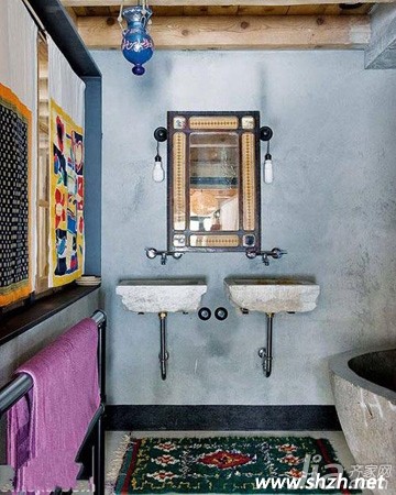 衛(wèi)浴間沒有繼續(xù)使用實木的材質(zhì),而是在吊燈上保留原木的同時使用了水泥的墻面,但是完**露的墻面以及顏色鮮艷的地毯都將整個空間渲染的個性十足。