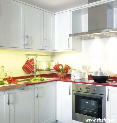 白色的廚房空間,紅色的臺面,讓單調(diào)的白色注入了活力。
