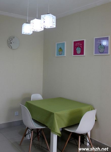 房屋的一角用作餐廳,方形的飯桌上仍然用的是綠色裝飾,墻上的掛鐘很漂亮,墻壁上三個(gè)冰淇淋擺設(shè)圖片,是否能夠增加你的食欲呢。