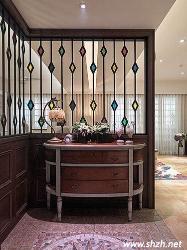 進門就用玄關(guān)將入戶處與客廳隔開,木質(zhì)的玄關(guān)上鑲上上透明的玻璃,讓客廳采光效果更加,復古的木質(zhì)桌椅,擺上歐式臺燈,看的出房屋主人對玄關(guān)處設(shè)計的用心,加上玻璃上五顏六色的菱形彩繪玻璃塊,讓室內(nèi)增添一股時尚。