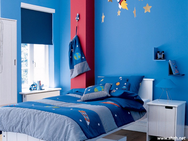 只有純真無邪的孩子才能配得上如此藍色星空夢幻般的房間,在這房間里,孩子會神清氣爽,充滿活力。低調(diào)而養(yǎng)眼的背景色與床單相應,床單上可愛的卡通圖案將可愛全部烘托出。就連窗簾也全部選用純藍色,讓孩子暢游在寶石藍般的幻想中。
