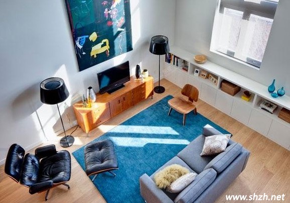 面積狹小的客廳排滿沙發(fā),皮椅,電視柜后顯得有點(diǎn)蹩腳的感覺,鋪上一塊純藍(lán)色地毯讓空間開闊起來(lái),與墻上的藍(lán)色圖畫相互配合,讓客廳清爽大氣。透過窗戶的陽(yáng)光,讓臥室空間光影重迭。