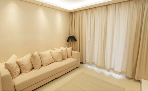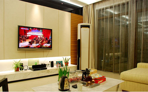 大面積的黑色烤漆玻璃和黑色系的電視機(jī),音響與淺色系的和諧、統(tǒng)一形成了鮮明的對(duì)比,給人一種時(shí)尚氣息。米色的沙發(fā)搭配簡(jiǎn)單的小碎花靠墊給人舒適溫暖的感覺,使簡(jiǎn)約中又不失溫馨。