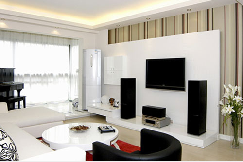 概要: 大面積的黑色烤漆玻璃和黑色系的電視機(jī),音響與淺色系的和諧、統(tǒng)一形成了鮮明的對(duì)比,給人一種時(shí)尚氣息。米色的沙發(fā)搭配簡(jiǎn)單的小碎花靠墊給人舒適溫暖的感覺,使簡(jiǎn)約中又不失溫馨??蛷d主要以白色為主顯得很清爽,適合白領(lǐng)新婚夫妻。瓷磚是現(xiàn)在很多客廳裝修的選擇,對(duì)于年輕人來說追求自己的舒適才是重點(diǎn)。瓷磚相對(duì)地板來說不僅方便平日清潔而且還能提升客廳的亮度。