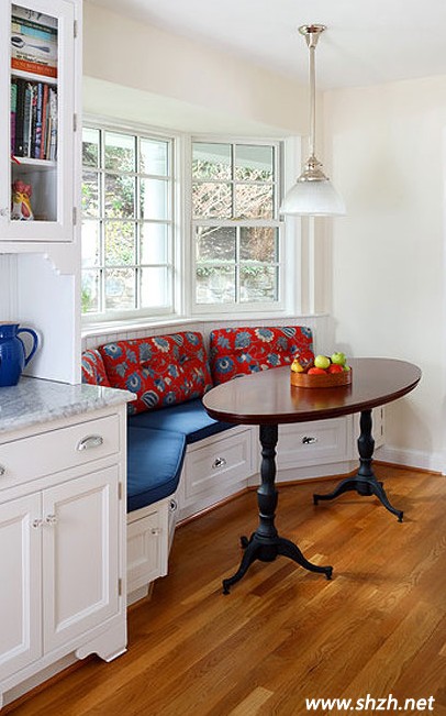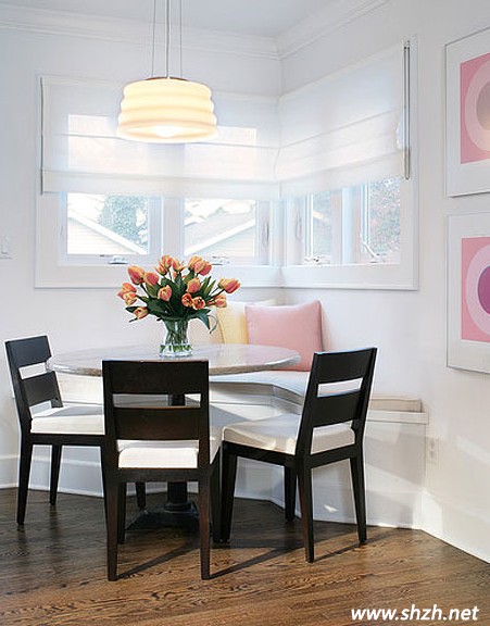 靠著角落擺上小小的L型的沙發(fā),干凈爽快,不僅能當作餐桌,閑暇的時候在這里看看報紙閱讀閱讀書籍也是一件美事。