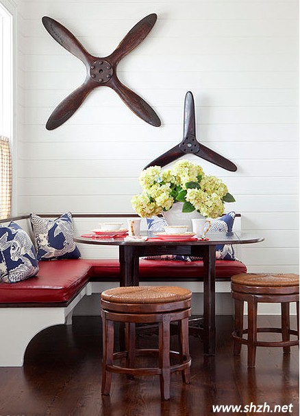 這樣的小餐桌設計的很有藝術感覺,上面的鏡子放大了室內的空間,藍色的沙發(fā)顯得更加溫暖舒適,旁邊鐵制的小餐椅也增加了幾分活潑性。