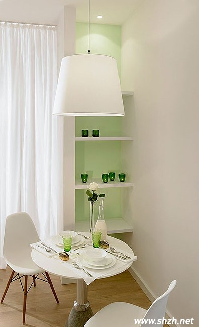 淺綠色的小清新的設計無形之中能增加人的食欲。旁邊收納區(qū)讓這小角落顯得干凈整潔,讓兩口之家盡顯浪漫色彩。