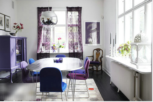 白色和黑色相搭配的餐廳具有時尚感,最好地表現(xiàn)出充滿品質(zhì)感的就餐空間。至于家具和配飾等,選擇紫色會令人沉靜平和,而深藍色的加入也更顯深邃意境。
